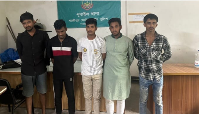 আটক যুবকদের মধ্যে রয়েছেন, পূবাইল কুদাব এলাকার মশিউর রহমান (১৯), আমিনুল ইসলাম (২৫), বরিশাল বানারীপাড়ার নাজমুল ইসলাম (১৯), মাদারীপুর কালকিনীর গোলাম রাব্বি (১৮) ও আরাফাত সিকদার (১৯)।