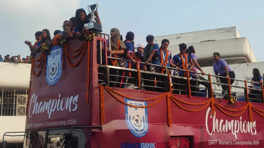 টানা দ্বিতীয়বার সাফ নারী চ্যাম্পিয়নশিপের শিরোপা জিতে ঢাকায় এসে পৌঁছেছে বাংলাদেশ নারী ফুটবল দল। তাদের বরন করতে আগে থেকেই এয়ারপোর্টে প্রস্তুত ছিলো ছাদ খোলা দোতলা বাস। জাতীয় পতাকা আর ফুল দিয়ে সাজানো বাসটির গায়ে লেখা ‘চ্যাম্পিয়ন’। সাফ নারী ফুটবল চ্যাম্পিয়নশিপ জয়ী বাংলাদেশ দলকে বহন করে বিমানবন্দর থেকে বাংলাদেশ ফুটবল ফেডারেশন অভিমুখে যায় বাসটি। ফুটবলাররা শিরোপা নিয়ে বেলা আড়াইটার দিকে কাঠমান্ডু থেকে দেশে ফেরেন।
