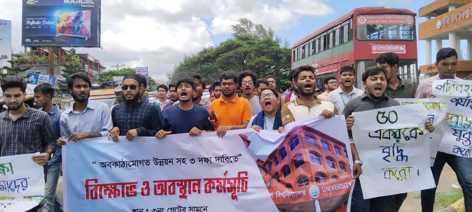 অবকাঠামোগত উন্নয়নসহ ৩ দফা দাবিতে বরিশাল বিশ্ববিদ্যালয়ের (ববি) সাধারণ শিক্ষার্থীরা বিশ্ববিদ্যালয়ের সামনে ঢাকা-পটুয়াখালী মহাসড়কে বিক্ষোভ মিছিল ও মানববন্ধন করেছে।