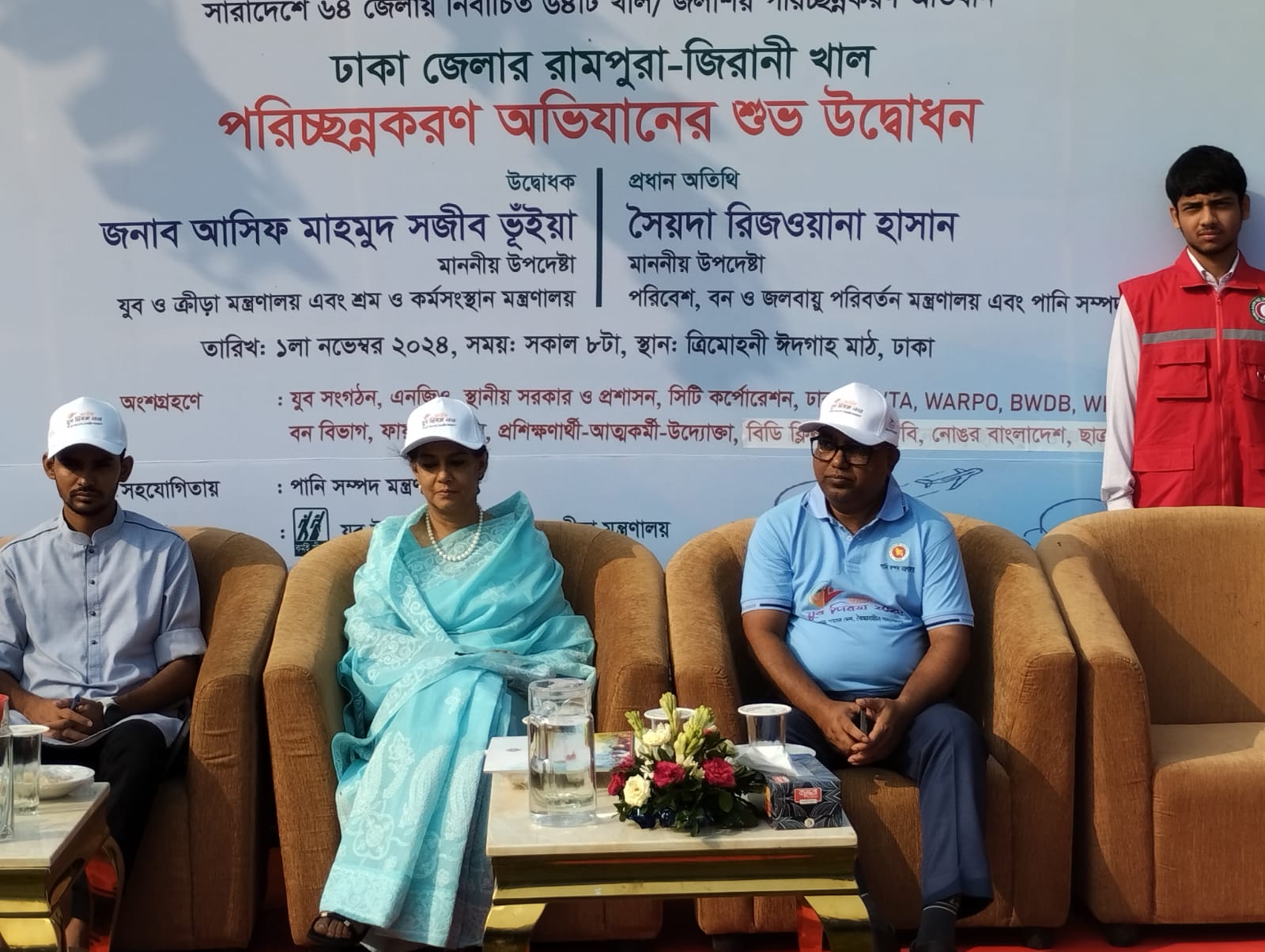 শুক্রবার সকালে ঢাকায় রামপুরা ত্রিমোহিনী ঈদগাহ মাঠে পানি সম্পদ মন্ত্রণালয়ের সহযোগিতায় ও যুব ও ক্রীড়া মন্ত্রণালয়ের যুব উন্নয়ন অধিদপ্তরের আয়োজনে অনুষ্ঠিত অনুষ্ঠানে ১ লা নভেম্বর জাতীয় যুব দিবস ২০২৪ উদযাপন উপলক্ষ্যে সারাদেশে ৬৪ জেলায় নির্বাচিত ৬৪ টি খাল/ জলাশয় পরিচ্ছন্নকরণ অভিযানের অংশ হিসেবে যুব ও ক্রীড়া উপদেষ্টা আসিফ মাহমুদ সজীব ভূঁইয়া রামপুরা-জিরানী খাল পরিচ্ছন্নকরণ অভিযানের শুভ উদ্বোধন করেন এবং এর মধ্য দিয়ে সারাদেশে একযোগে ৬৪ জেলায় ৬৪ টি চিহ্নিত খাল/জলাশয় পরিচ্ছন্নকরণের কার্যক্রম শুরু হয়।