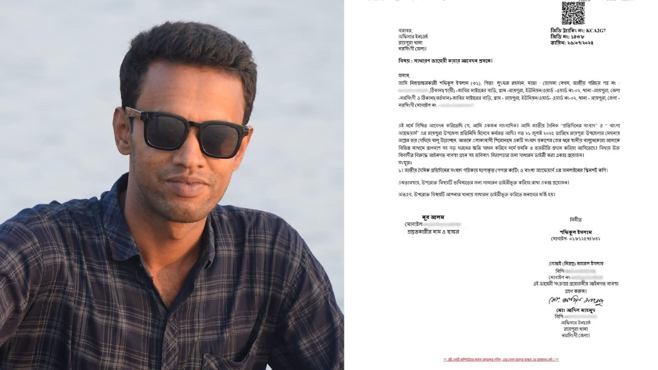অন্যদিকে, সংবাদ প্রকাশের জেরে স্থানীয় সাংবাদিক শফিকুল ইসলামকে বিভিন্ন ব্যক্তির মাধ্যমে প্রাণনাশের হুমকি দেওয়া হচ্ছে বলে অভিযোগ উঠেছে। বিষয়টি তিনি রায়পুরা থানায় একটি সাধারণ ডায়েরির (জিডি) মাধ্যমে অবগত করেছেন।