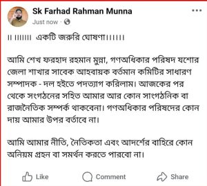 যশোরে গণঅধিকার পরিষদের জেলা কমিটির সাধারণ সম্পাদক শেখ ফরহাদ রহমান মুন্না পদত্যাগ করেছেন। শ্রমিকলীগ নেতার যোগদান ও অনৈতিক অর্থ লেনদেনের অভিযোগকে কেন্দ্র করেই তিনি এই সিদ্ধান্ত নেন। রোববার বিকেলে নিজের ফেসবুক টাইমলাইনে পদত্যাগের ঘোষণা দেন মুন্না।