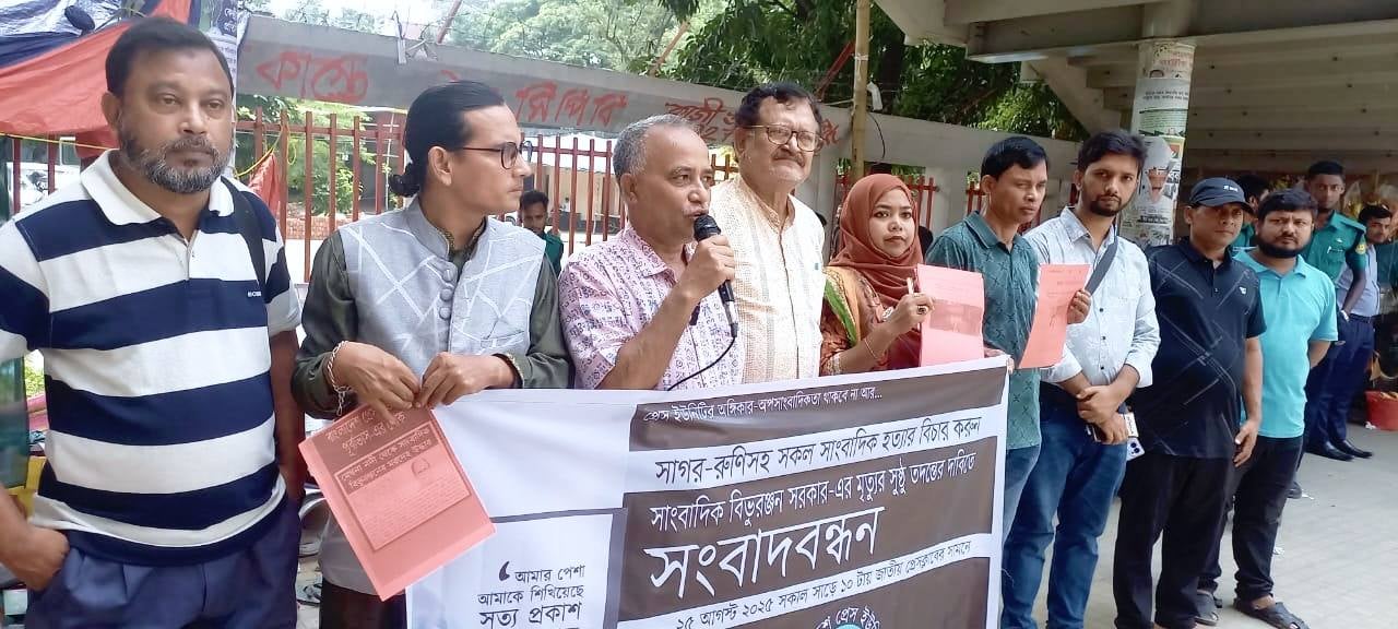 সাংবাদিক বিভুরঞ্জনের মৃত্যুর সুষ্ঠু তদন্ত এবং সাগর-রুনিসহ সকল সাংবাদিক হত্যার বিচারের দাবিতে মানববন্ধন করেছে বাংলাদেশ প্রেস ইউনিটি নামের একটি সংগঠন।