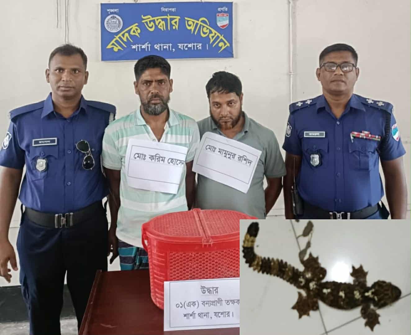 যশোরের শার্শায় বিলুপ্ত প্রায় বন্যপ্রাণী তক্ষক সাপসহ করিম হোসেন (৪৮) ও মামুনুর রশীদ (৪২) নামে দুই পাচারকারীকে আটক করেছে পুলিশ।