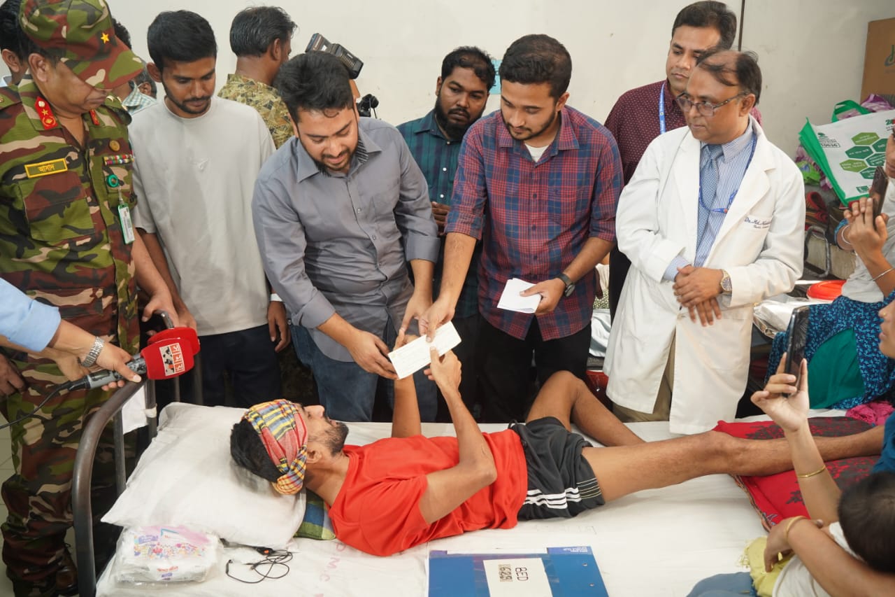 ঢাকা মেডিকেল কলেজ হাসপাতালে চিকিৎসাধীন ছাত্র জনতার আন্দোলনে আহতদের জুলাই শহীদ স্মৃতি ফাউন্ডেশনের পক্ষ থেকে অনুদানের চেক হস্তান্তর করেন ডাক,