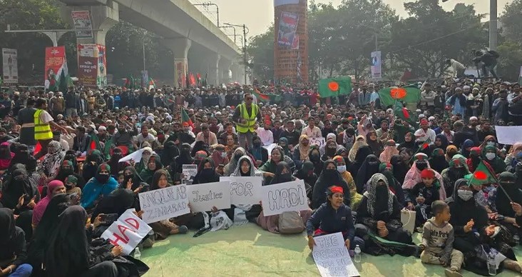 ইনকিলাব মঞ্চের শহিদ মুখপাত্র শরিফ ওসমান হাদির হত্যার বিচারের দাবিতে রাজধানীর শাহবাগ মোড় অবরোধ করে অবস্থান কর্মসূচি পালন করছে ইনকিলাব