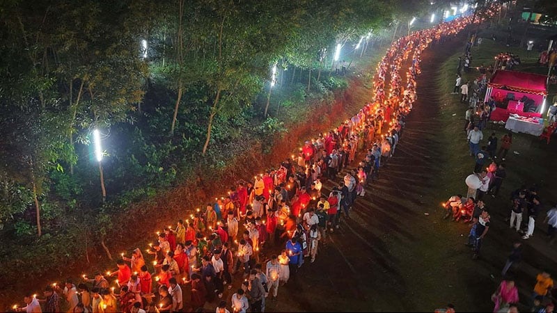 মোমবাতি জ্বালিয়ে মনের বাসনা পূরণ ও পূণ্য লাভের আশায় প্রায় দুই কিলোমিটার উঁচু-নিচু পাহাড়ি পথ পাড়ি দেন হাজারো ভক্ত। আলোকিত