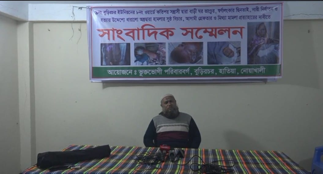 হাতিয়ার বুড়ির চর ইউনিয়নে সন্ত্রাস, ঘর-বাড়ি ভাঙচুর, স্বর্ণালঙ্কার ছিনতাই এবং নারীদের প্রতি হামলার অভিযোগে ভুক্তভোগী পরিবার সংবাদ সম্মেলন করেছে। বৃহস্পতিবার