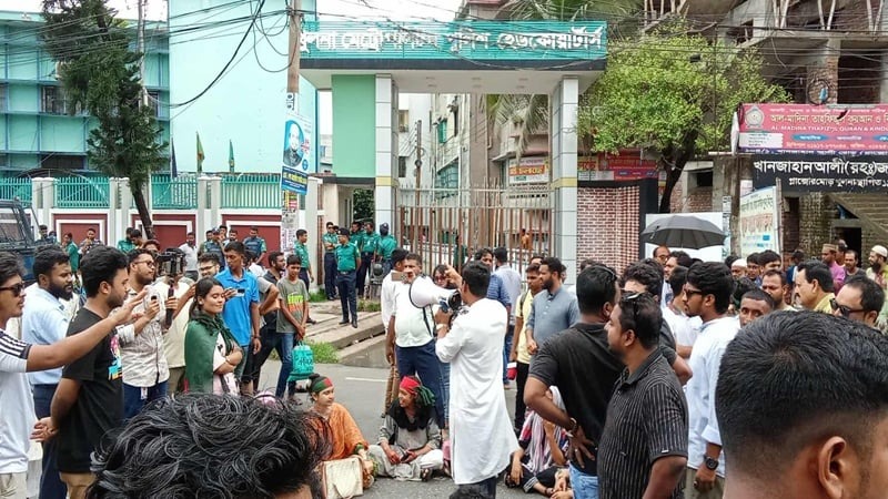 খুলনায় পুলিশের হেফাজতে থাকা উপপরিদর্শক (এসআই) সুকান্ত দাসকে ছেড়ে দেওয়ার প্রতিবাদে বৈষম্যবিরোধী ছাত্র আন্দোলন ও ছাত্রদলের নেতাকর্মীরা খুলনা মেট্রোপলিটন পুলিশের