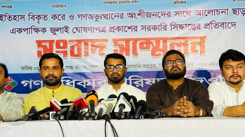 অংশীজনদের সঙ্গে আলোচনা ও স্বীকৃতি ছাড়াই চূড়ান্ত করা হয়েছে ‘জুলাই ঘোষণাপত্র’ এই অভিযোগে তা প্রত্যাখ্যান করার ঘোষণা দিয়েছে গণঅধিকার পরিষদ।