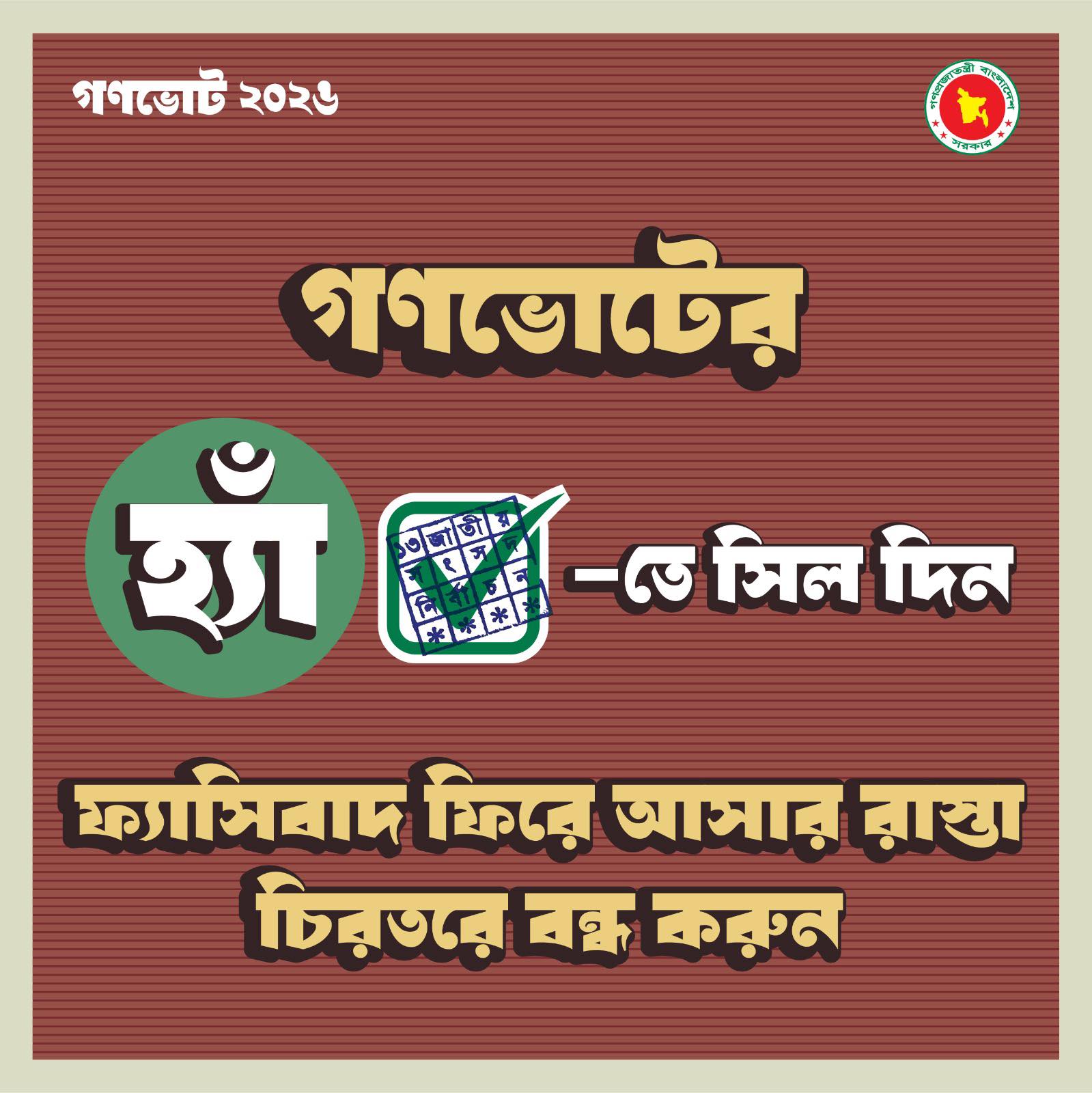 প্রধান উপদেষ্টার প্রেস উইং সামাজিক যোগাযোগমাধ্যমে একটি ফটোকার্ড প্রকাশ করেছে, যা নাগরিকদের গণভোটে ‘হ্যাঁ’ ভোট দিতে উৎসাহিত করার পাশাপাশি সচেতনতা