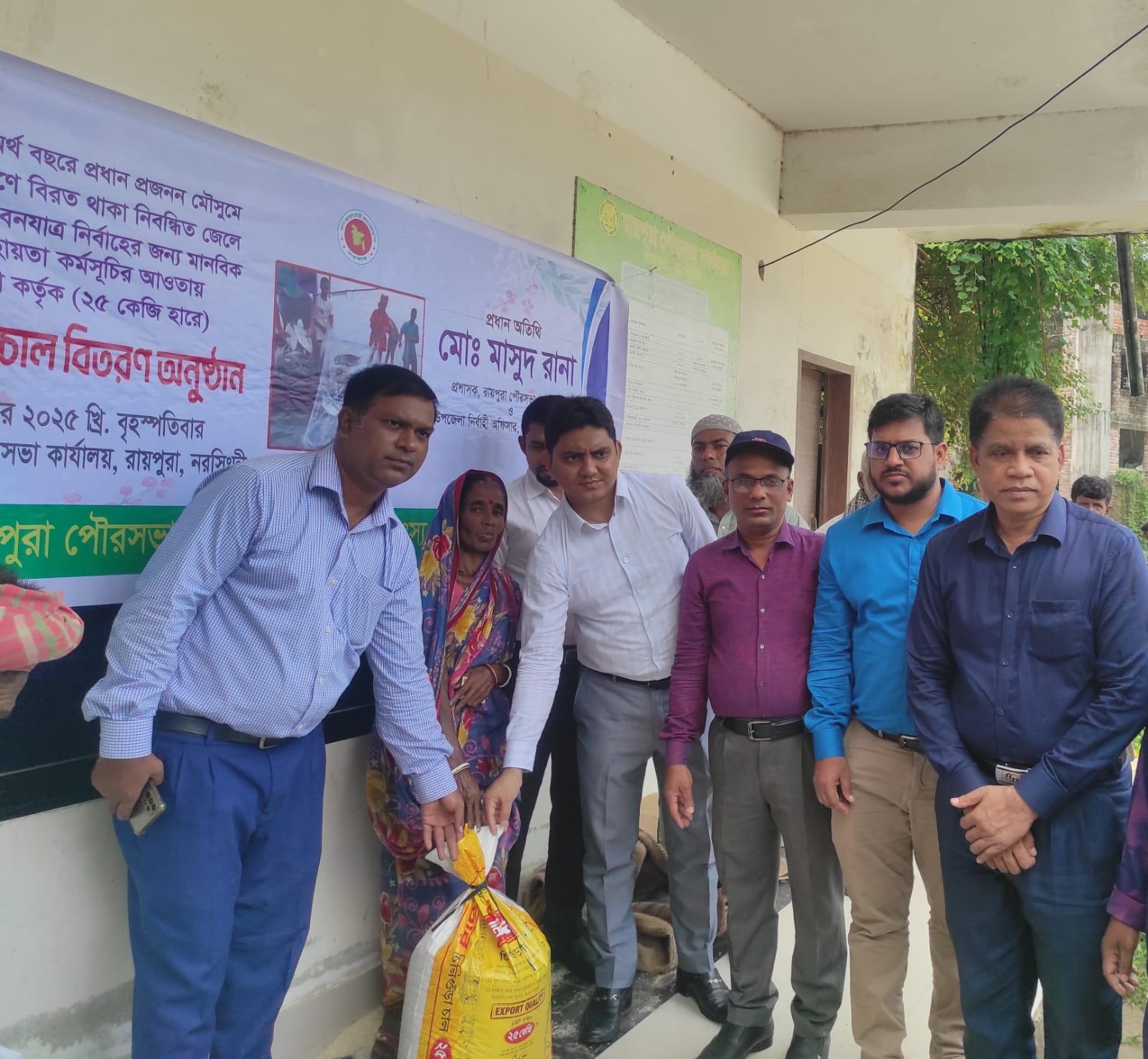নরসিংদীর রায়পুরা পৌরসভায় প্রধান প্রজনন মৌসুমে ইলিশ আহরণে বিরত থাকা নিবন্ধিত জেলে পরিবারের জীবনযাত্রা সহায়তায় মানবিক খাদ্য সহায়তা কর্মসূচির আওতায়