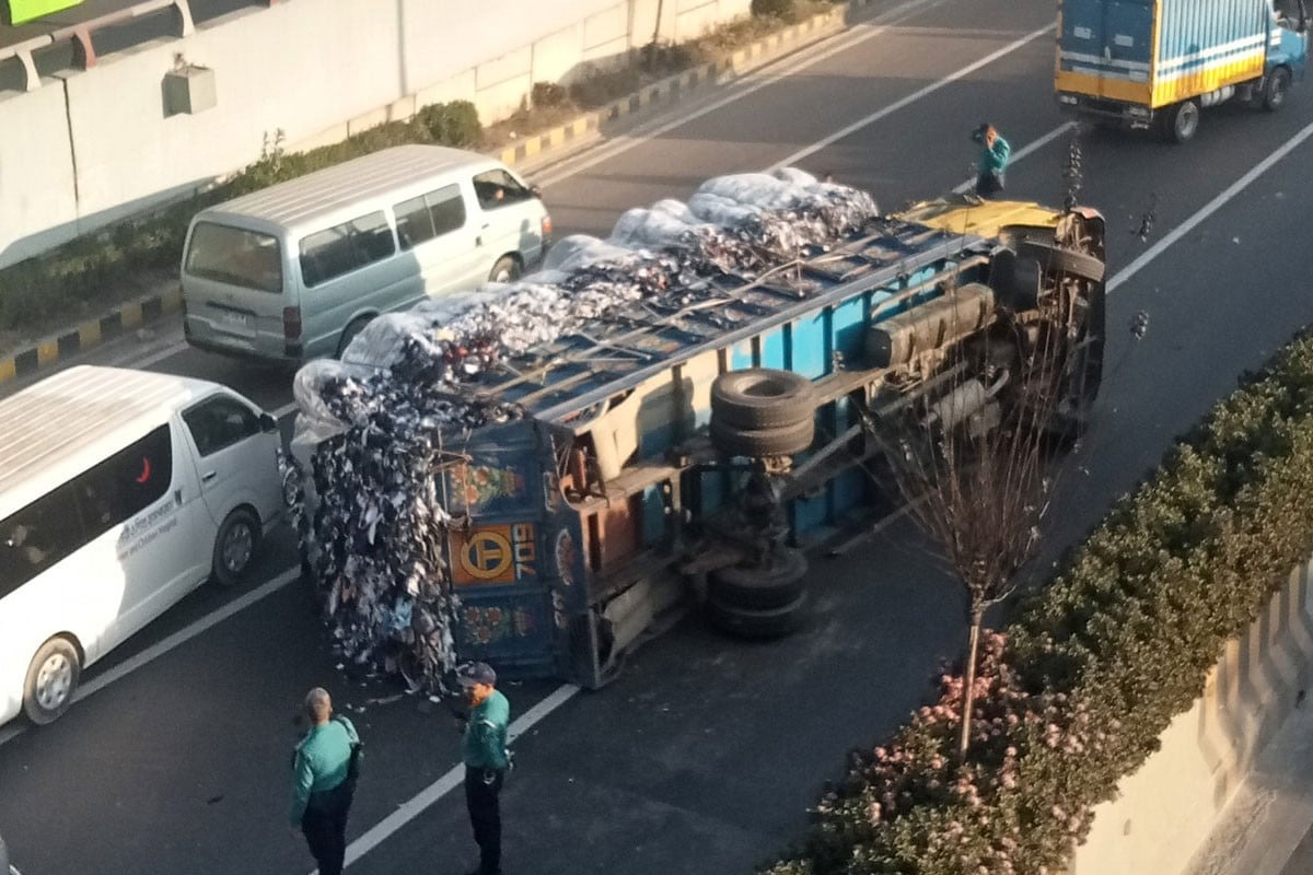 এয়ারপোর্ট রোডে ট্রাক উল্টে তীব্র যানজট