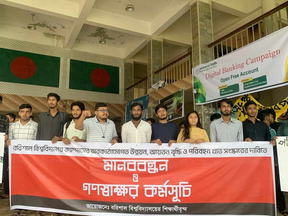 বরিশাল বিশ্ববিদ্যালয় (ববি)-এর অবকাঠামোগত উন্নয়ন, আয়তন বৃদ্ধি এবং পরিবহন খাত সংস্কারের দাবিতে মানববন্ধন ও গণস্বাক্ষর কর্মসূচি পালন করেছেন বিশ্ববিদ্যালয়ের শিক্ষার্থীরা।