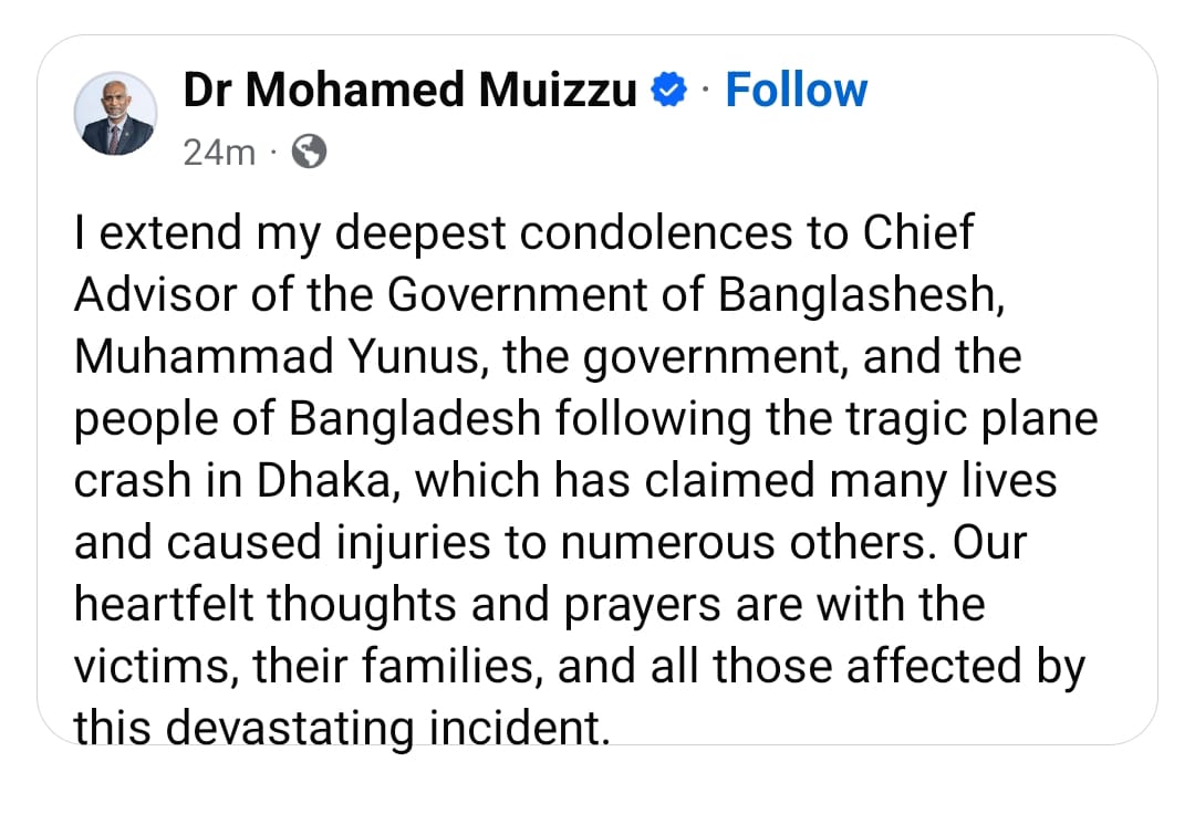 বাংলাদেশের রাজধানী ঢাকায় মর্মান্তিক বিমান দুর্ঘটনায় বহু মানুষের প্রাণহানির ঘটনায় গভীর শোক ও সমবেদনা জানিয়েছেন মালদ্বীপের প্রেসিডেন্ট ড. মোহাম্মদ মুইজ্জু।