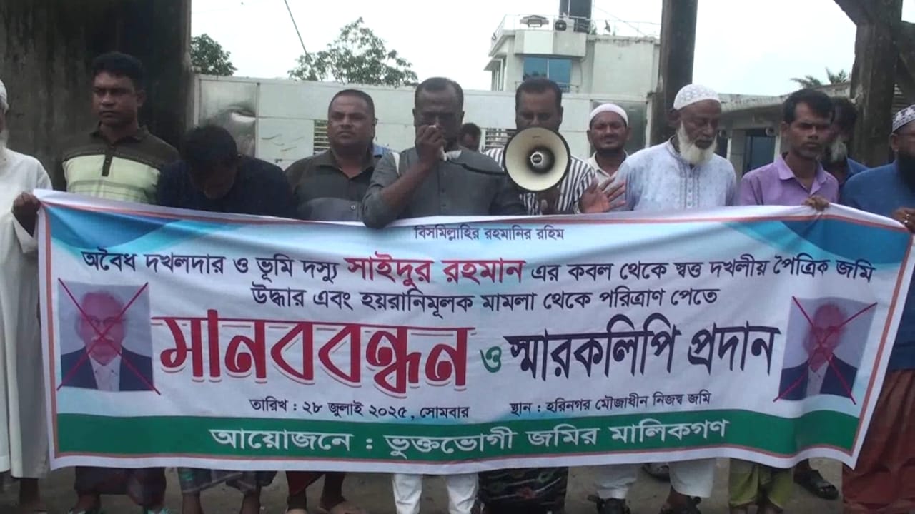 সাতক্ষীরার শ্যামনগরে নিজস্ব জমি রক্ষার দাবিতে এবং হয়রানিমূলক মামলার প্রতিবাদে মানববন্ধন করেছেন প্রায় ৪০০ জমির মালিক। সোমবার (২৮ জুলাই) সকালে