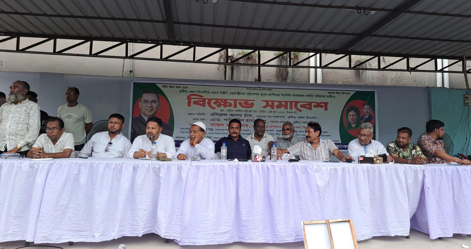 কুষ্টিয়া জেলা বিএনপির বর্তমান আহ্বায়ক কমিটিকে মামা-ভাগ্নের নেতৃত্বাধীন বিতর্কিত ও মেয়াদোত্তীর্ণ কমিটি আখ্যা দিয়ে অবিলম্বে এই কমিটি বাতিলের দাবিতে বিক্ষোভ