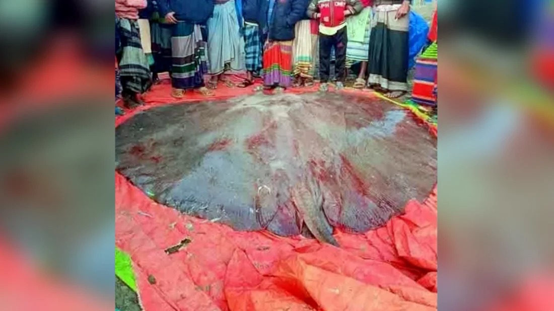 নোয়াখালীর হাতিয়া উপজেলায় জেলেদের জালে ধরা পড়েছে প্রায় ৫০০ কেজি ওজনের বিশাল শাপলা পাতা মাছ, যা স্থানীয়ভাবে হাউস মাছ নামে