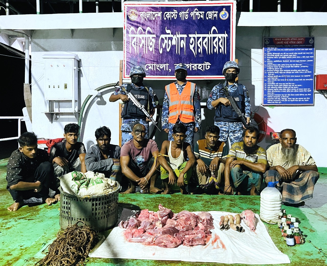 সুন্দরবনের হারবারিয়ায় সাড়ে ১৩ কেজি হরিণের মাংস ও ১৮ কেজি অবৈধ কাঁকড়াসহ ৮ জন হরিণ শিকারীকে আটক করেছে কোস্ট গার্ড।